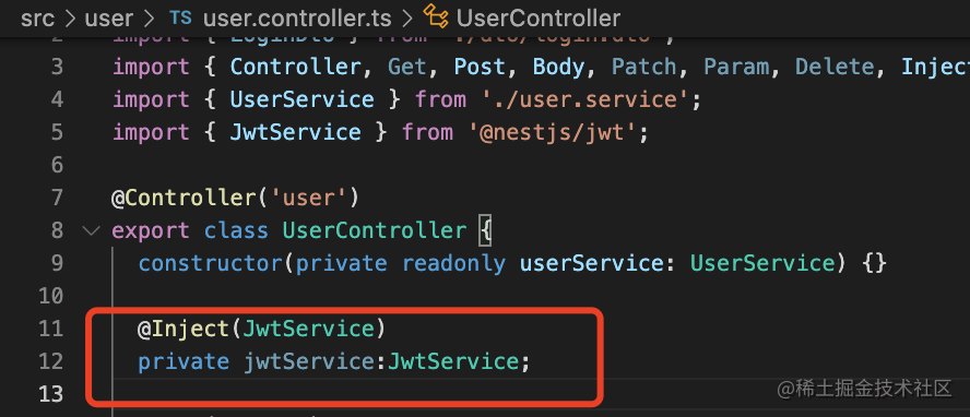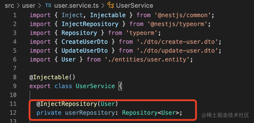 通过 TypeOrmModule.forRoot、TypeOrmModule.forFeature 的动态模块添加数据源,拿到 User 的 Repository。