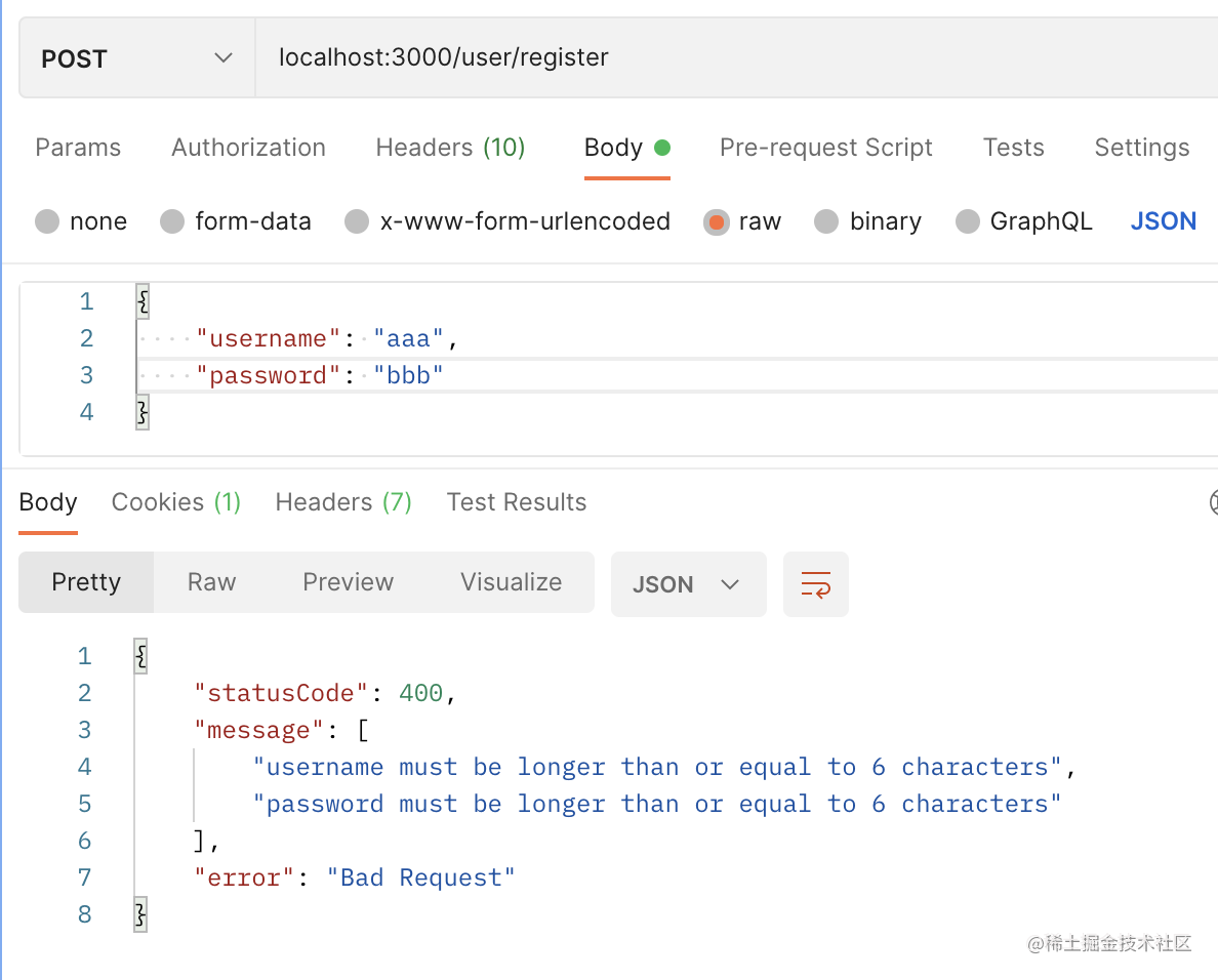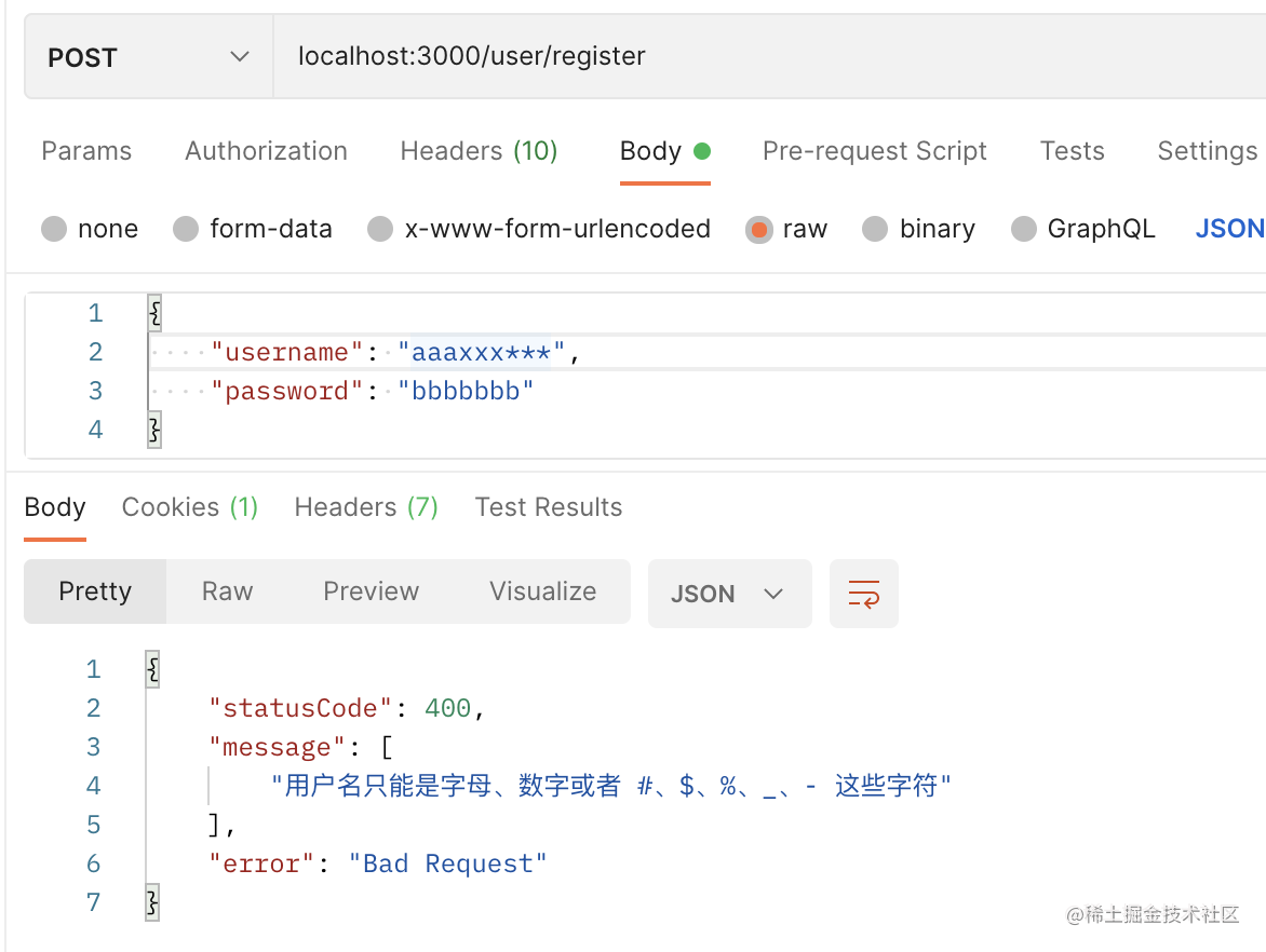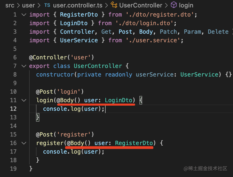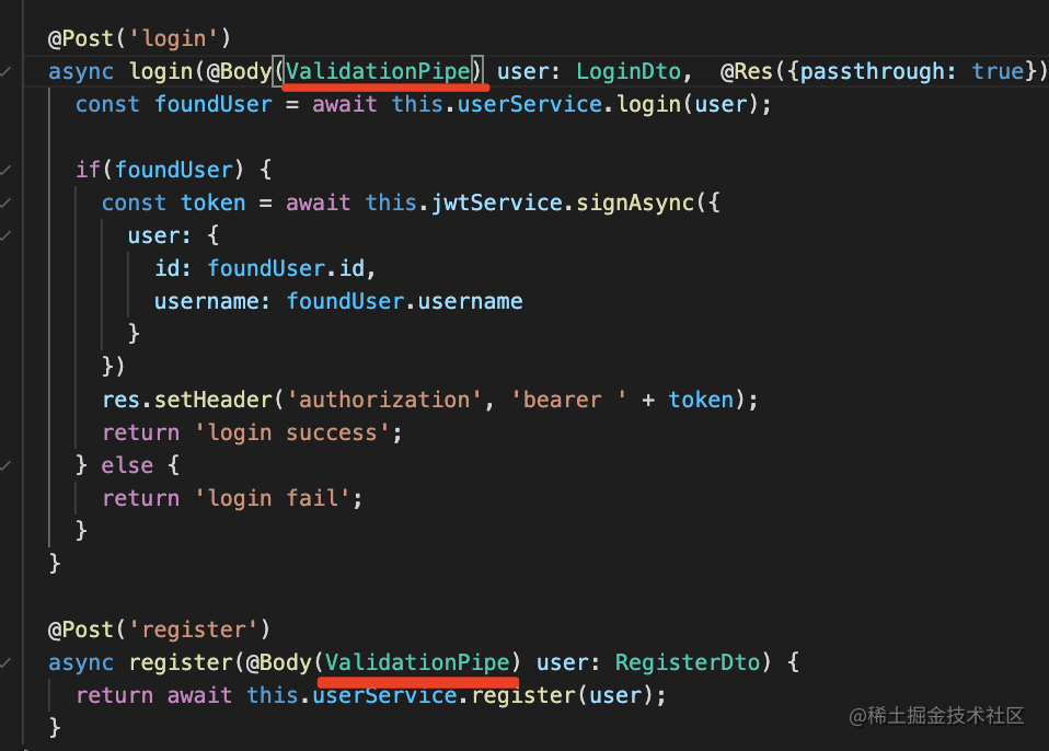 npm install class-validator class-transformer然后给 /user/login 和 /user/register 接口添加 ValidationPipe: