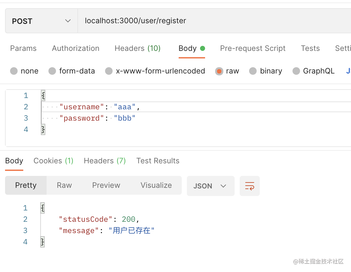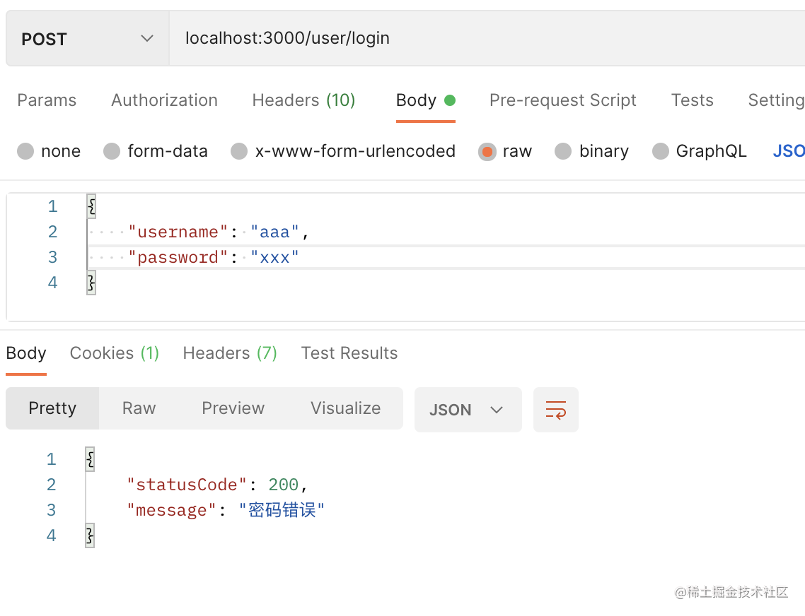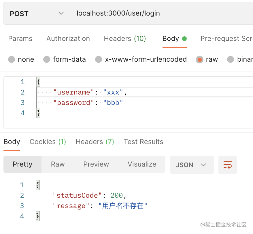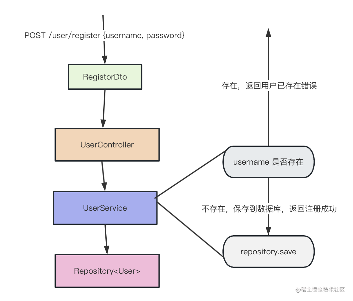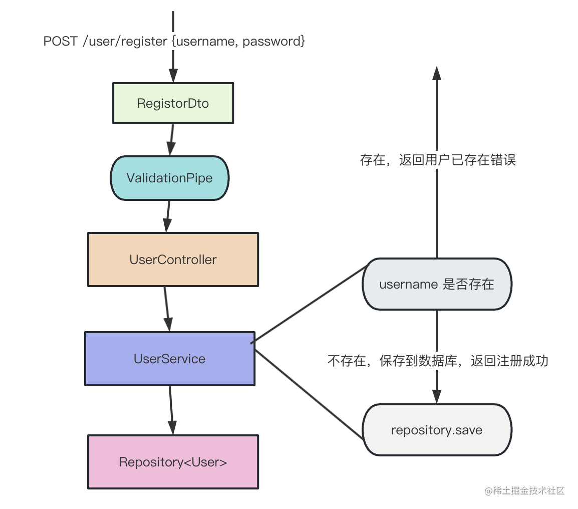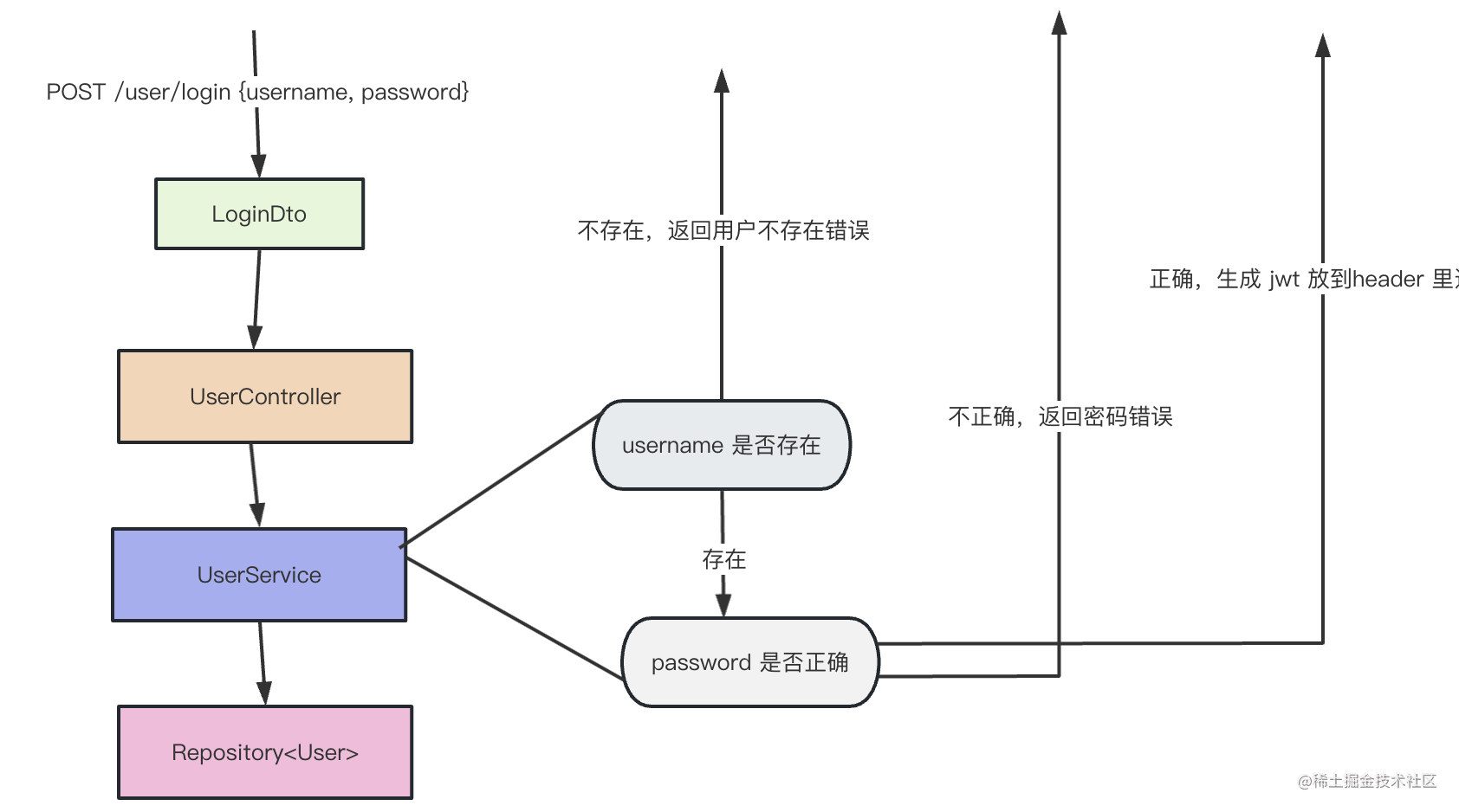 }根据用户名查找用户,没找到就抛出用户不存在的 HttpException、找到但是密码不对就抛出密码错误的 HttpException。