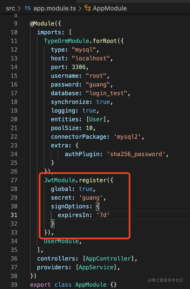 global:true 声明为全局模块,这样就不用每个模块都引入它了,指定加密密钥,token 过期时间。