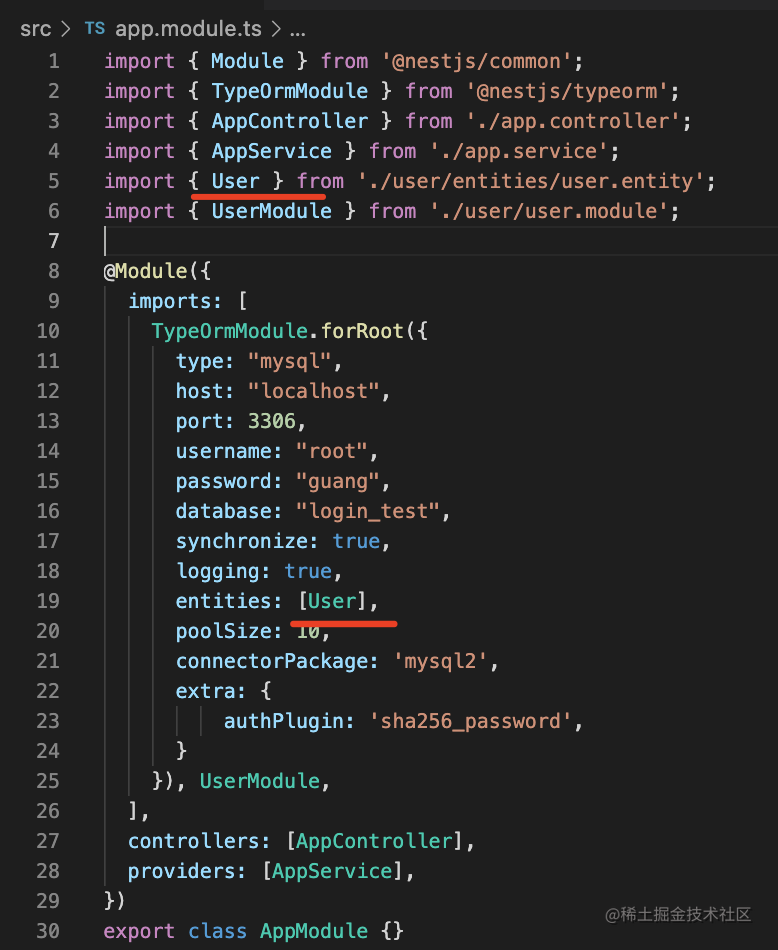 然后在 AppModule 里引入 TypeOrmModule,传入 option: