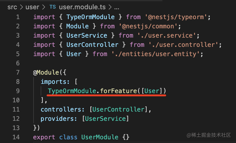 然后我们在 UserModule 引入 TypeOrm.forFeature 动态模块,传入 User 的 entity。