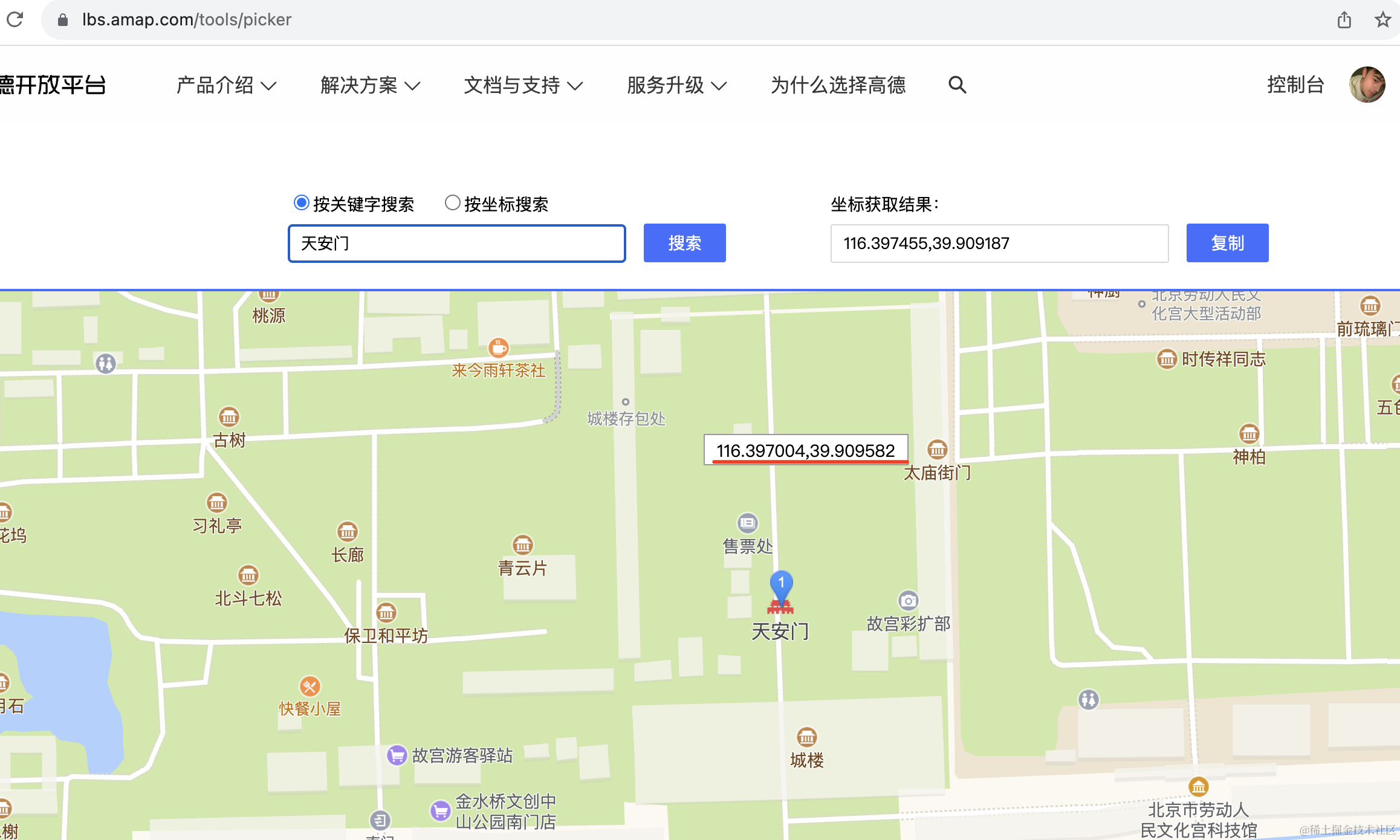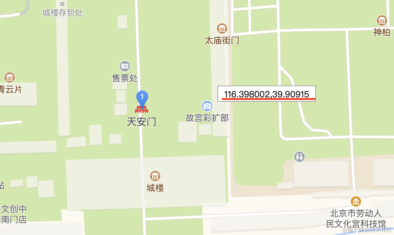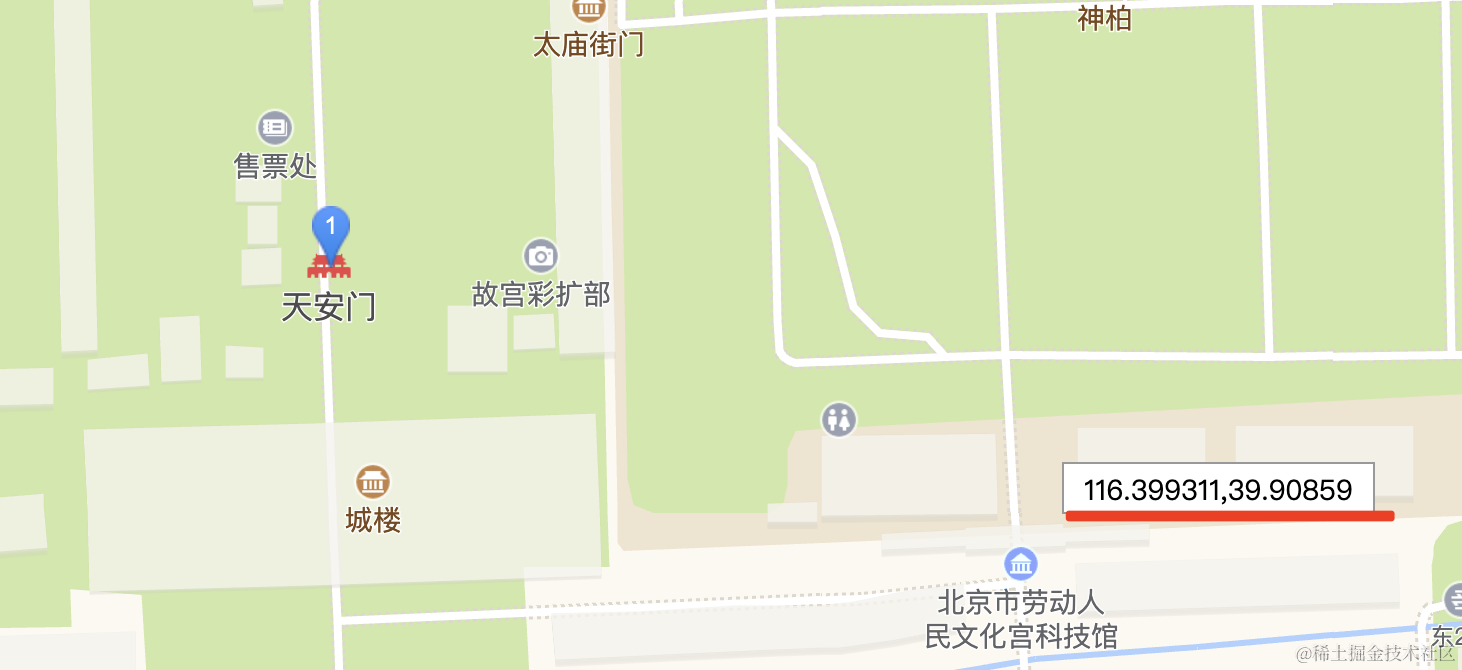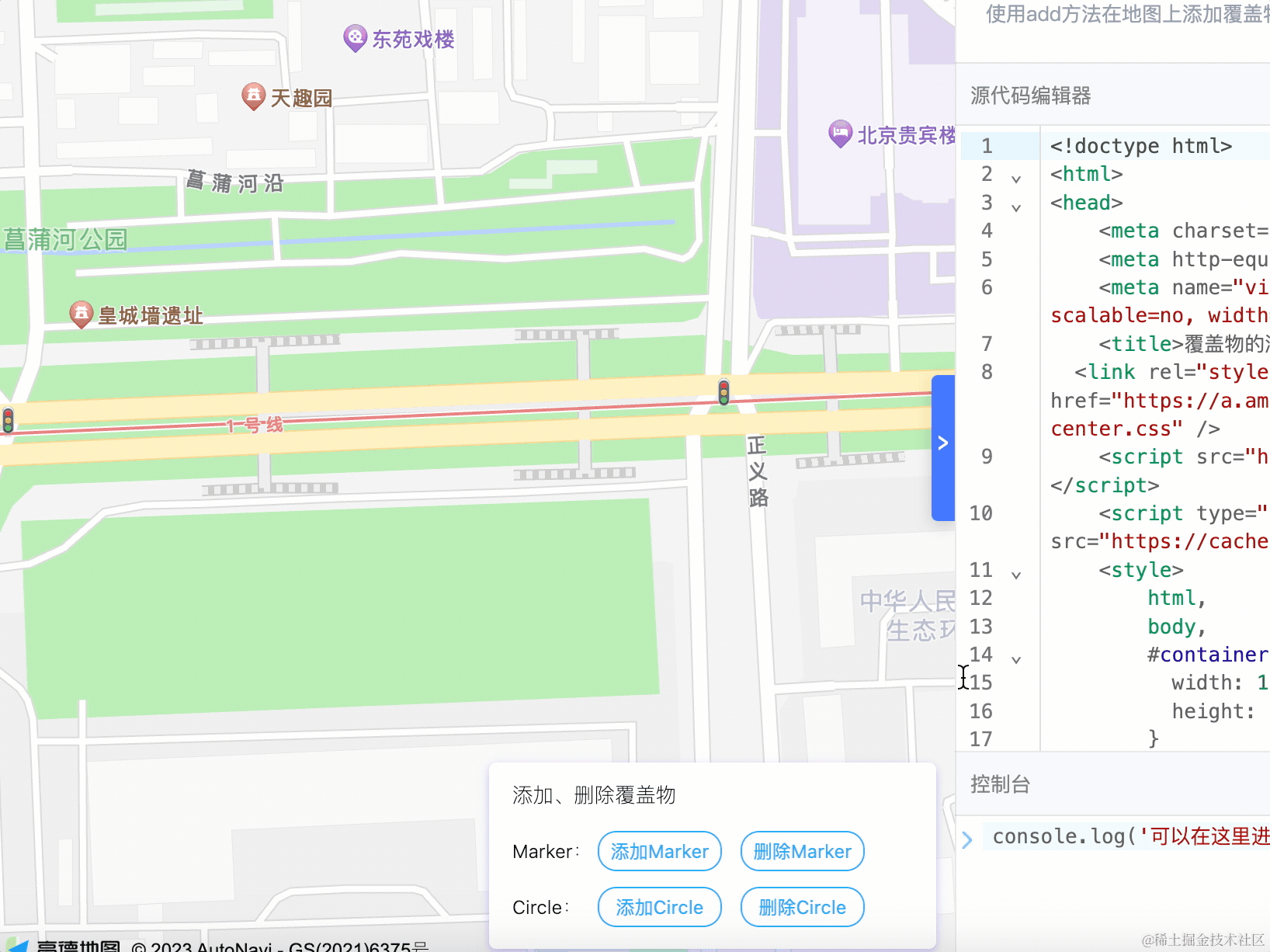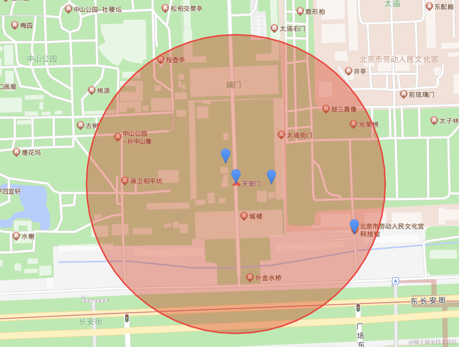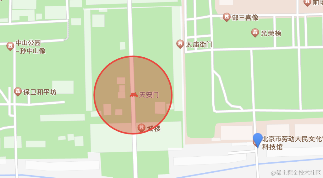 </html>在天安门画了一个 circle,然后在文化宫科技馆画了一个 marker: