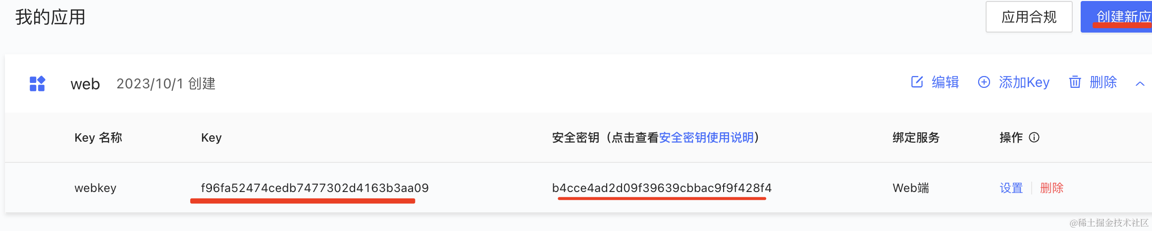 点击创建新应用,选择 web 应用,就可以生成 key 了
