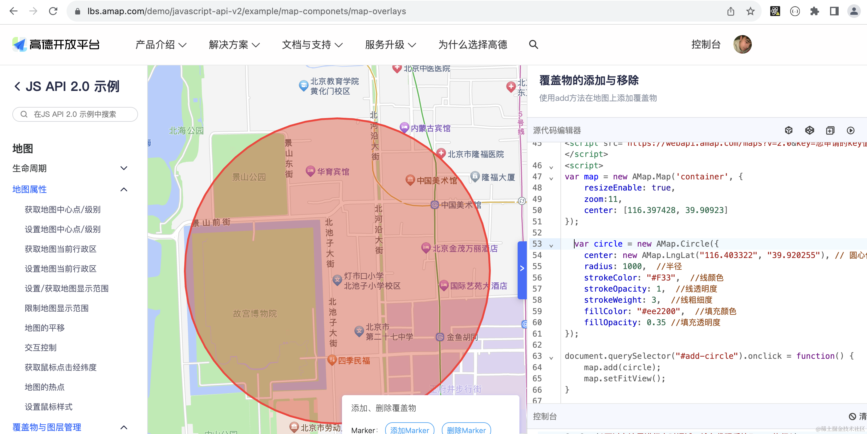 比如上面我们分别在地图上绘制了 marker 和 circle:
