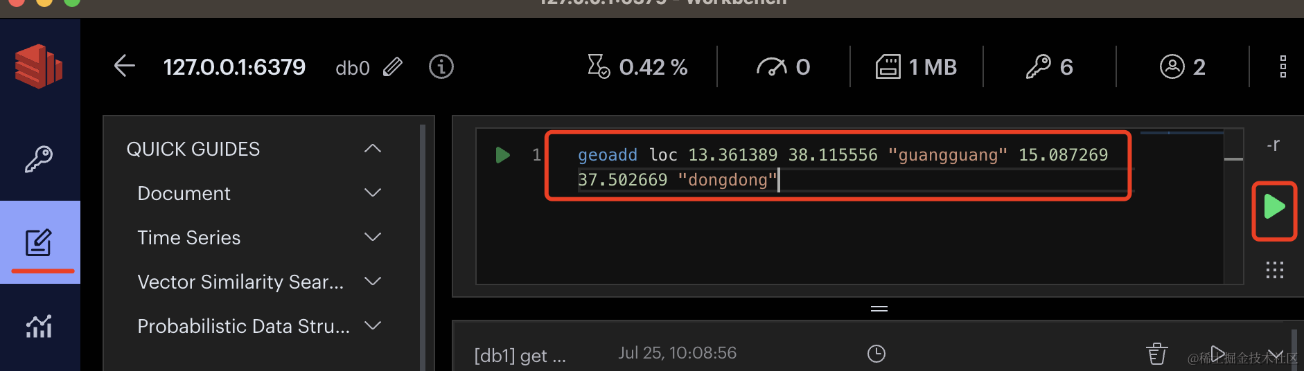 在 RedisInsight 里输入命令,点击执行: